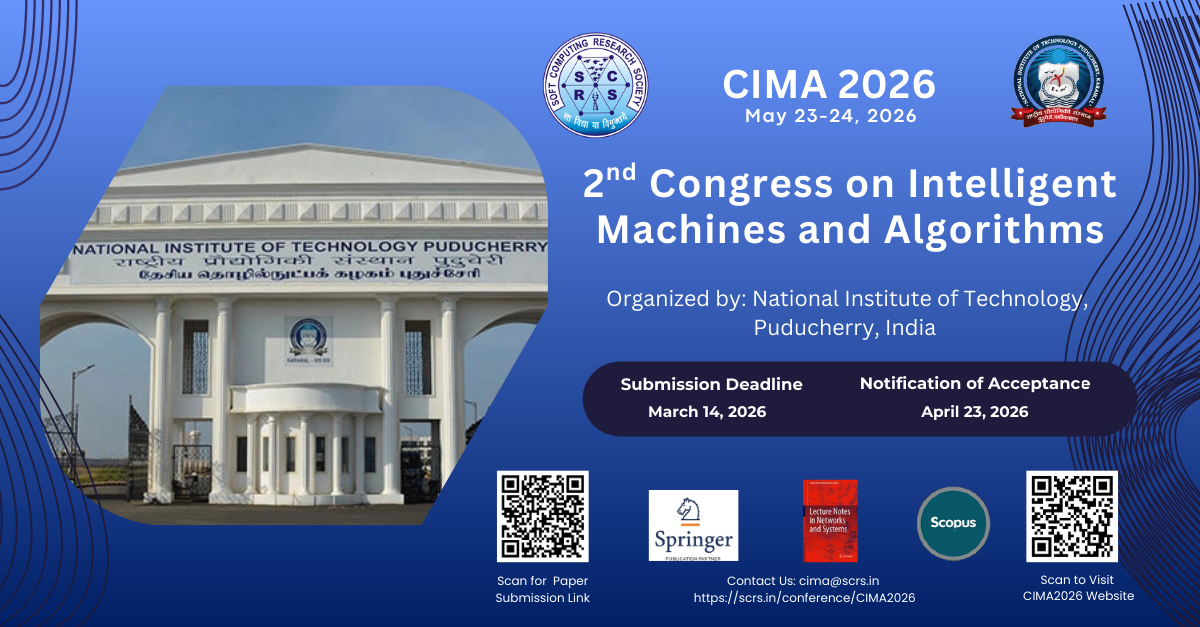 National Institute of Technology, Puducherry, India is going to organize the 2nd Congress on Intelligent Machines and Algorithms (CIMA 2026) in Hybrid Mode scheduled to be held during 27-28 June 2026. The conference is technically sponsored by the Soft Computing Research Society (SCRS).