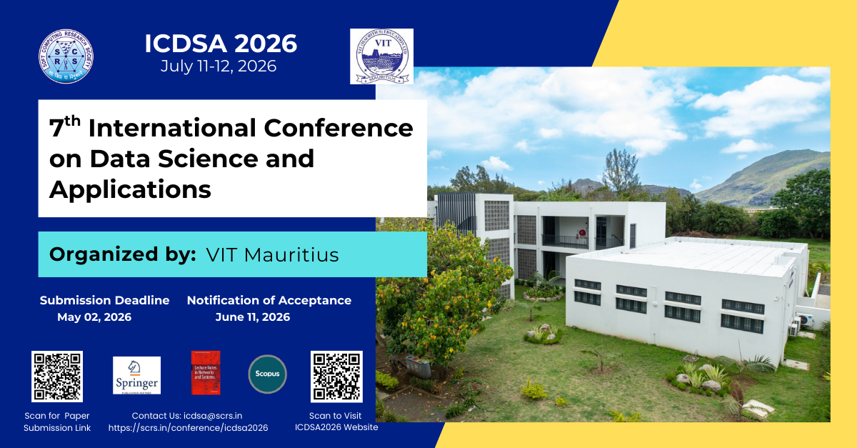 ICDSA 2026 - VIT Mauritius, Mauritius | July 11-12, 2026 VIT Mauritius is going to organize the 7th International Conference on Data Science and Applications (ICDSA 2026) in technical support of the Soft Computing Research Society (SCRS) from July 11-